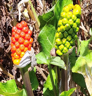 - Berries: In late summer (August–September), as the leaves wilt, the plant produces tight clusters of berries that transition from green to a vibrant orange-red.